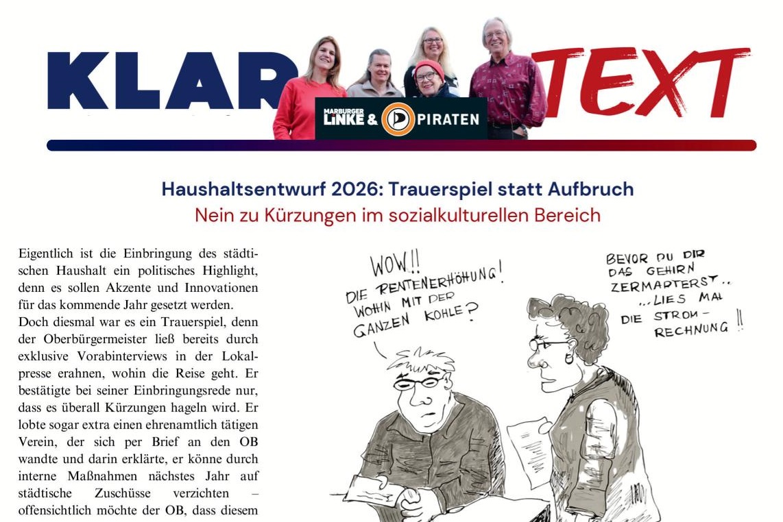 Neuer „Klartext“ 11/2025 der Fraktion Marburger Linke & Piraten erschienen Die neuste Ausgabe des “Klartext” der Fraktion Marburger Linke & Piraten ist erschienen. Es geht u. a. um den Haushaltsentwurf 2026 und den geplanten Kürzungen im sozialkulturellen Bereich sowie der Bezahlkarte für Geflüchtete. Auch die fehlenden KITA-Plätze kommen ebenso zur Sprache, wie die Forderung nach Ausweitung kommunaler Bürger*innenräte / -beteiligung.…