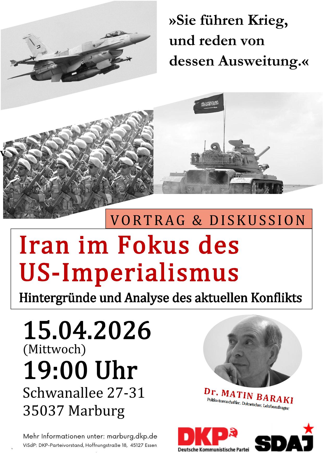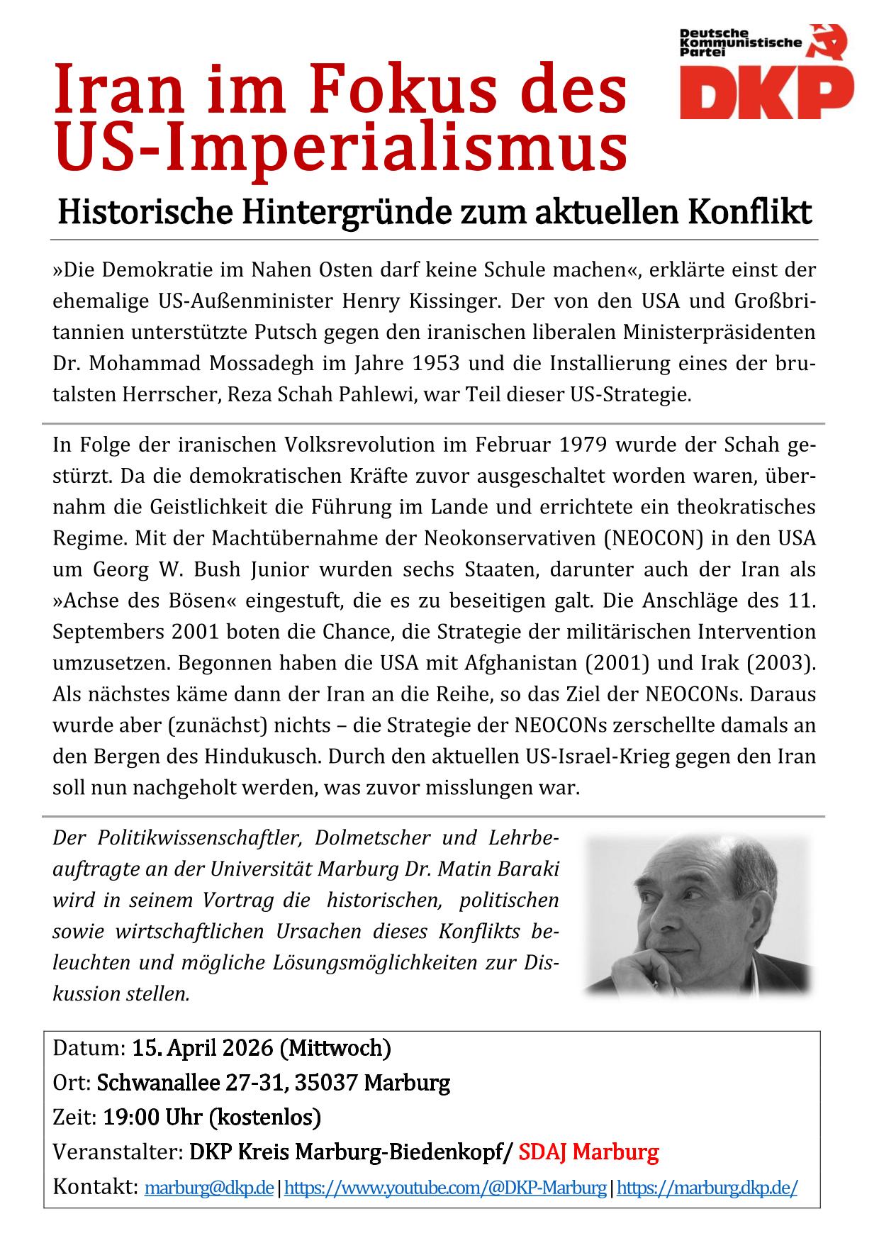 Die DKP Marburg-Biedenkopf lädt gemeinsam mit der SDAJ Marburg herzlich ein zur Vortags- und Dikussionsveranstaltung »Iran im Fokus des US-Imperialismus – Hintergründe und Analyse des aktuellen Konflikts« mit Dr. Matin Baraki. Unser Referent, Dr. Matin Baraki, Politikwissenschaftler, Dolmetscher und Lehrbeauftragter an der Universität Marburg, beleuchtet die historischen Hintergründe des aktuellen Krieges der USA und Israels gegen den Iran – ausgehend von der Einflussnahme westlicher Staaten im 20. Jahrhundert über die Folgen der Revolution von 1979 bis hin zur heutigen Rolle des Iran im Spannungsfeld internationaler Machtinteressen. Dabei analysiert er die strategischen Zielsetzungen der USA und ihrer Verbündeten, die aktuellen Entwicklungen im Nahen Osten sowie mögliche Perspektiven für Deeskalation und politische Lösungen.