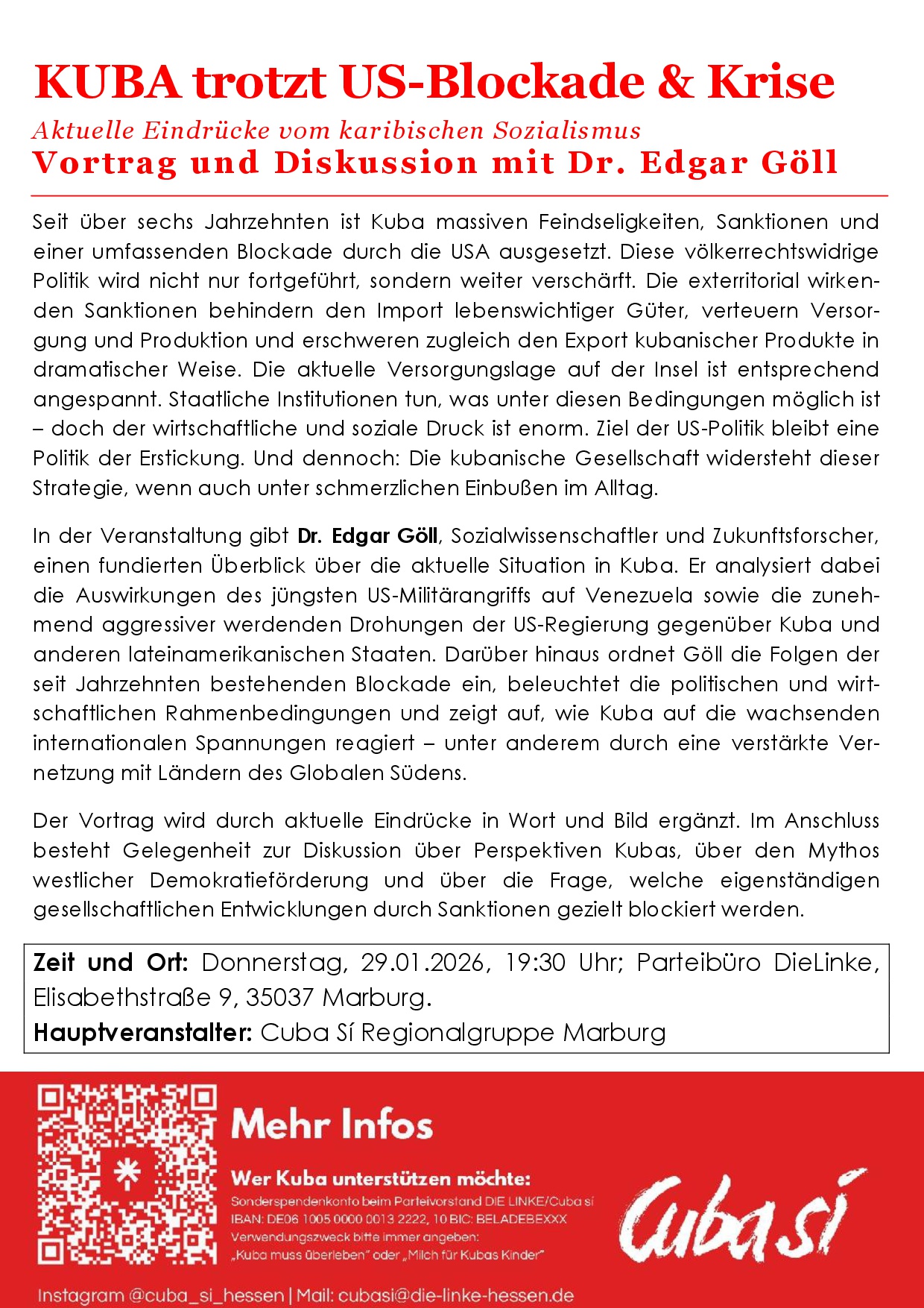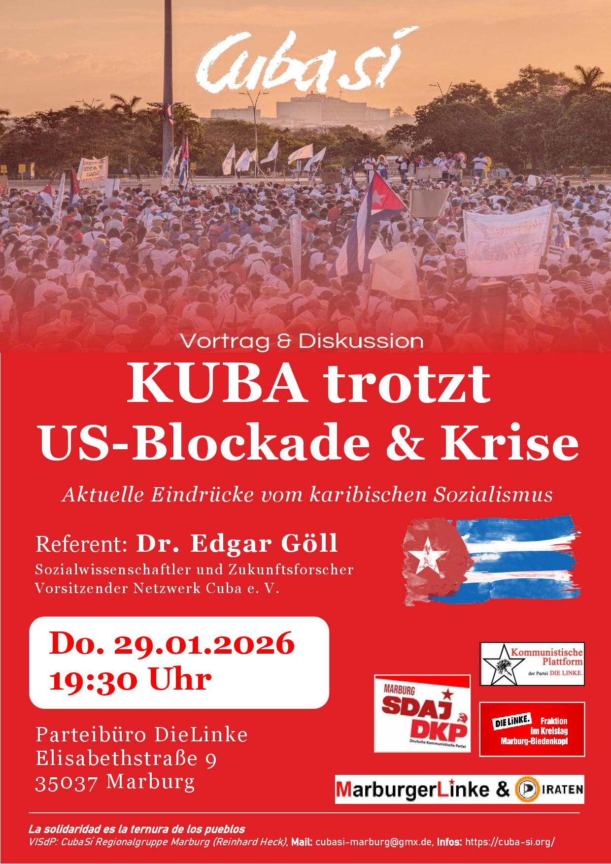 Die DKP Marburg-Biedenkopf, die Landesarbeitsgemeinschaft Cuba Sí in der LINKEN sowie die Kommunistische Plattform Hessen, die Fraktion MarburgerLinke Piraten und Die Fraktion DieLINKE im Kreistag Marburg-Biedenkopf laden herzlich zur Vortrags- und Diskussionsveranstaltung »KUBA trotzt US-Blockade & Krise – Aktuelle Eindrücke vom karibischen Sozialismus« am 29.01.2026 um 19:30 Uhr in das Parteibüro DieLINKE in Marburg ein.