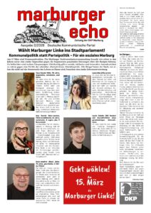 Irgendwo gibt es noch das hektografierte Exemplar einer Zeitung aus dem Jahr 1931. Der Titel heißt „Marburger Echo“. Herausgegeben wurde es von der Kommunistischen Partei Deutschlands (KPD). Unter anderem berichtete ein Bauer mit dem Namen Nau aus dem Ebsdorfergrund dort über seine Reise in die Sowjetunion, wo es ihm gut gefallen hatte. Als Anfang der siebziger Jahre die Deutsche Kommunistische Partei (DKP) eine Lokalzeitung gründete, nannte sie sie „Marburger Echo“. Der KPD-Vorgänger war damals noch nicht bekannt. Das Blatt wurde Straße für Straße in die Briefkästen gesteckt. Das Marburger Echo machte die Positionen der DKP im ganzen Landkreis bekannt. Es hatte einen großen Anteil an den Wahlerfolgen dieser Partei seit 1972. 1989 war damit Schluß, zunächst schien es für immer. Die DKP verlor viele Mitglieder, aber sie brach nicht zusammen. Bis 1993 blieb sie noch in der Stadtverordnetenversammlung. Es zeigte sich in den vergangenen Jahren, daß die Lücke, die die „alte“ DKP 1989 hinterlassen hatte, nicht durch andere Organisationen geschlossen werden konnte, auch nicht durch die PDS und ihr „Neues Marburg“. So lange es den Kapitalismus gibt, wird es kommunistische Parteien geben, seien sie groß oder klein. Und in Marburg wird es immer wieder ein (Marburger) Echo dieser Kämpfe geben.