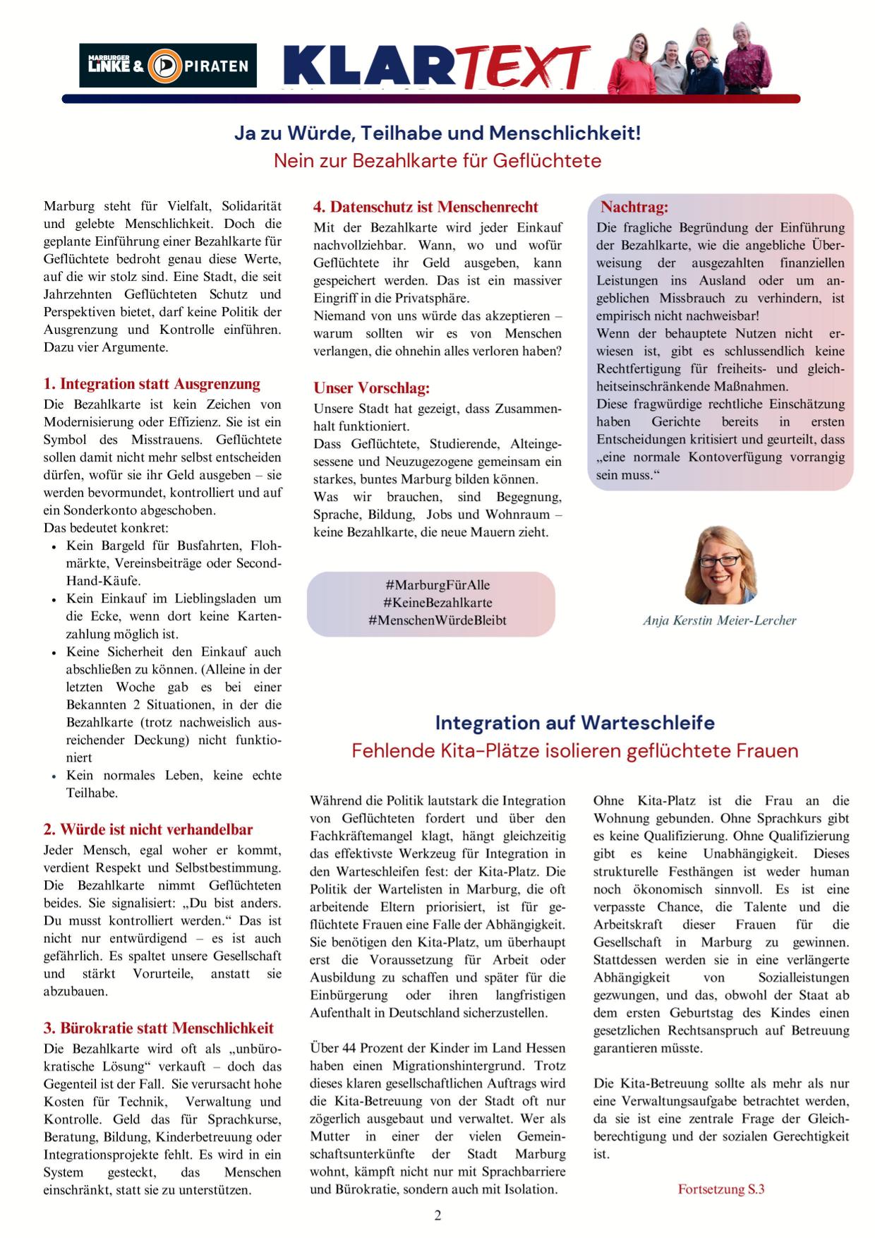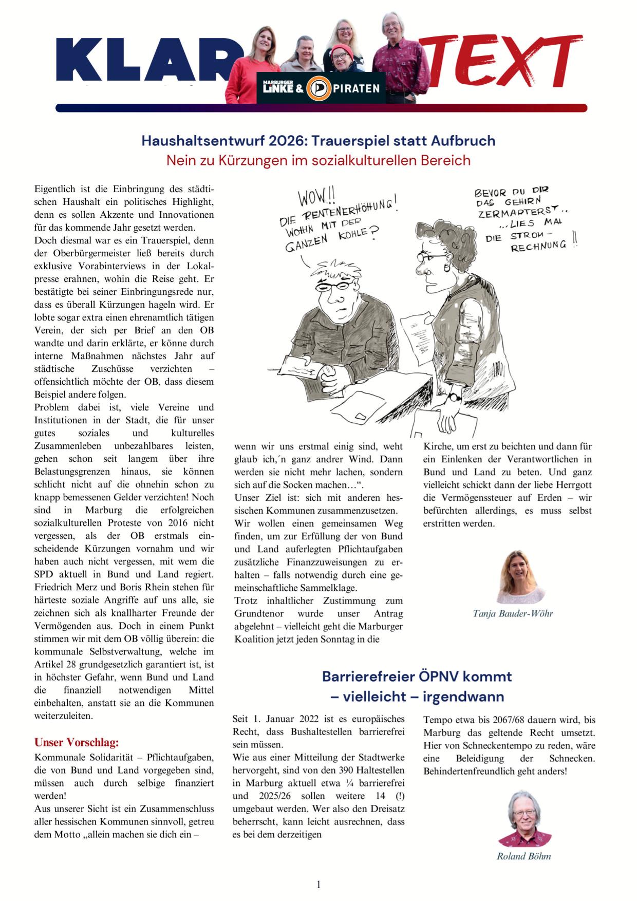 Die neuste Ausgabe des “Klartext” der Fraktion Marburger Linke & Piraten ist erschienen. Es geht u. a. um den Haushaltsentwurf 2026 und den geplanten Kürzungen im sozialkulturellen Bereich sowie der Bezahlkarte für Geflüchtete. Auch die fehlenden KITA-Plätze kommen ebenso zur Sprache, wie die Forderung nach Ausweitung kommunaler Bürger*innenräte / -beteiligung.